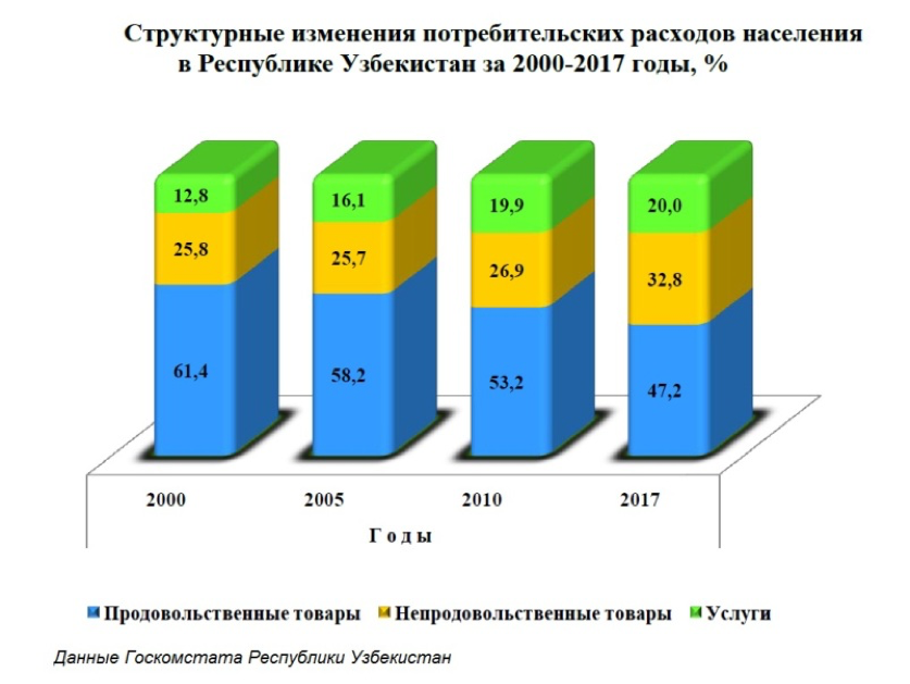 Несмотря на то, что доля расходов на продовольственные товары сокращается, она продолжает оставаться высокой. Так, если в 2000 году доля затрат на приобретение продовольственных товаров в структуре потребительских расходов составляла более 61 процента, то в 2017 году она уменьшилась на 14,2 единицы (до 47,2 процента). Согласно данным Госкомстата, почти 94 процента расходов на покупку продовольственных товаров приходится на приобретение продуктов питания и около 5 процентов – тратится на питание вне дома.