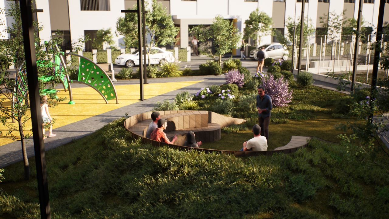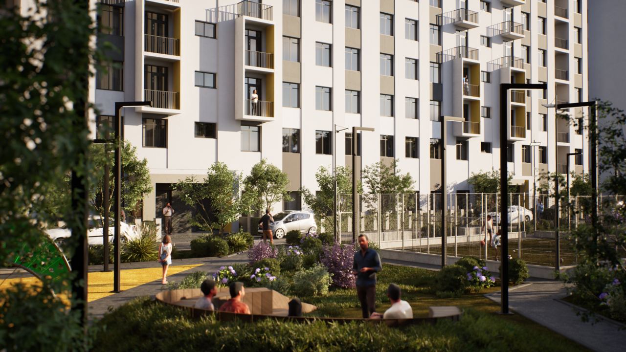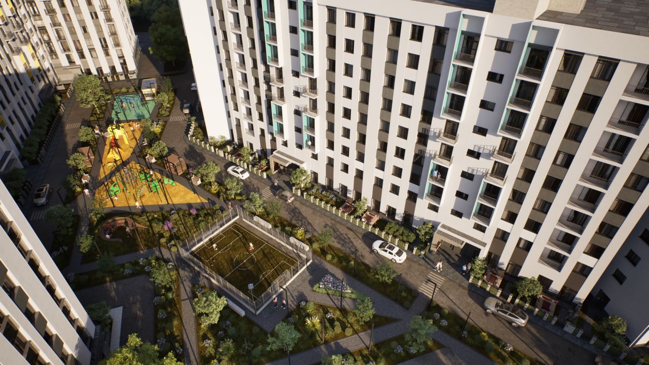 Внутри жилого комплекса развернута многофункциональная зона для тренировок, способная заменить оборудованный спортзал и обеспечить возможность занятий на свежем воздухе. Кроме того, во дворе организованы безопасные игровые зоны для детей разных возрастов, где расположена площадка с местами отдыха для родителей.