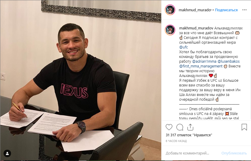 Узбекский боец ММА опубликовал пост в своем Istagram, где он рассказал о том, что он подписал контракт с UFC.