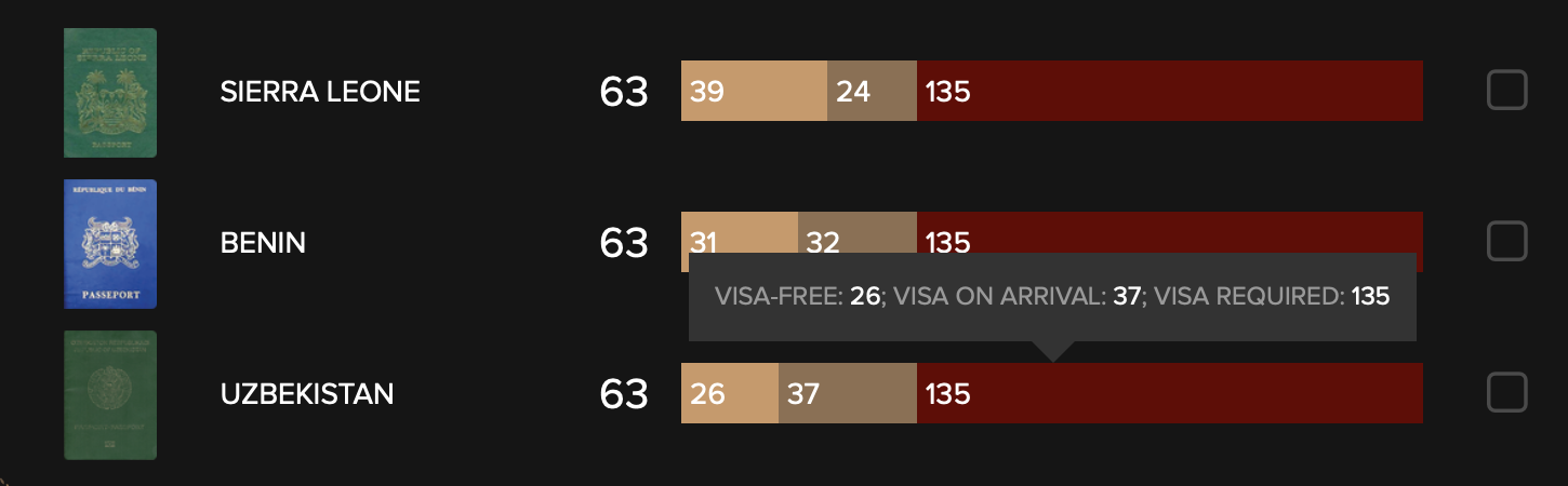 Отмечается, что граждане Узбекистана могут путешествовать без визы в 26 стран, еще в 37 странах необходимо оформлять визу по приезду, а в оставшиеся 135 стран для граждан Узбекистана обязательно требуется виза перед выездом из страны. Позиция паспорта в рейтинге формировалась на основе именно этих данных.