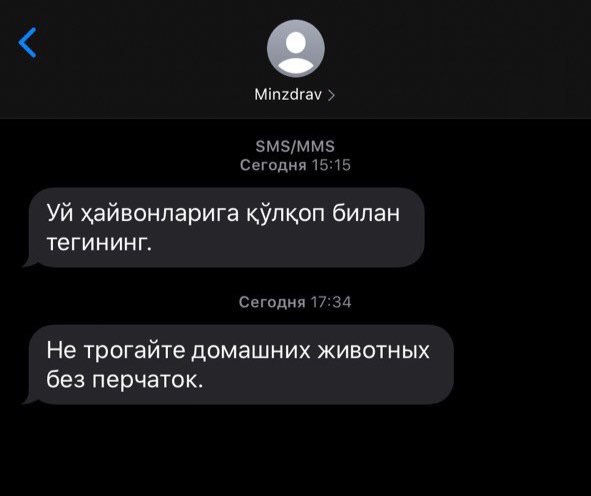 Минздрав Узбекистана начал присылать сообщения на номера абонентов с просьбой дотрагиваться до домашних питомцев в перчатках. Многие пользователи соцсетей стали выражать недовольство и непонимание ситуации. В редакцию также поступали вопросы о правдивости данных сообщений. Repost решил разобраться в ситуации.