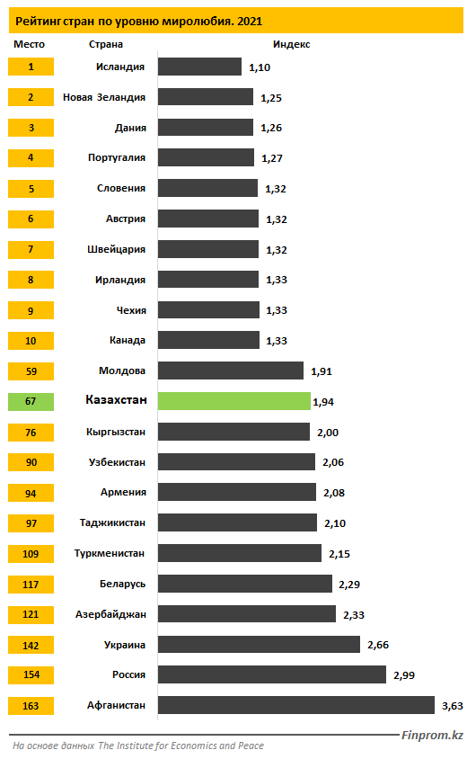 Индекс страны составил 2,062. Отмечается, что, чем выше индекс, тем менее миролюбивой считается страна.
