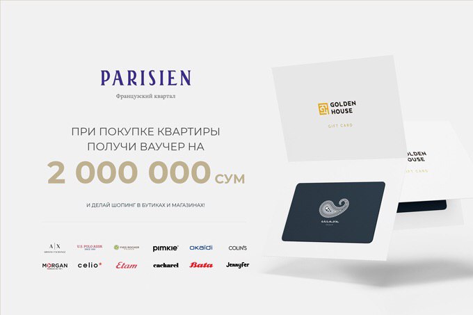 Кроме того, при покупке квартиры до 31 июля, вы становитесь обладателем подарочного ваучера номиналом 2 000 000 сум, с помощью которого мы можете совершать шопинг в известных магазинах и бутиках партнёра Golden House — Eurasia Group (Jennyfer, Bata, cacharel, Colin's, Etam, Okaidi, Pimkie, U.S. Polo Assn, celio*, Yves Rocher, Morgan, Armani Exchange).