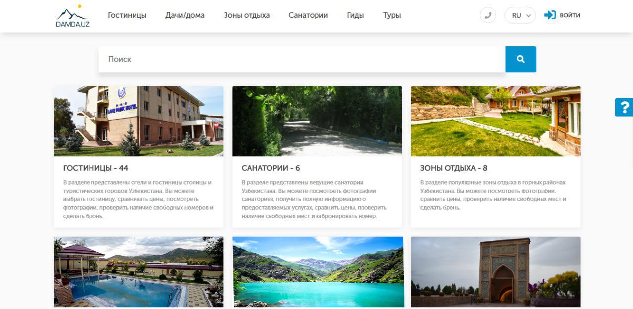 Таковым является проект Damda.Uz – онлайн сервис бронирования номеров в гостиницах, санаториях, зонах отдыха, а также дома/дачи, туры и гиды. С его помощью, вы можете быстро оформить бронирование номера в гостиницах Узбекистана, подыскать подходящее место для отдыха, а также забронировать тур и услуги гида.