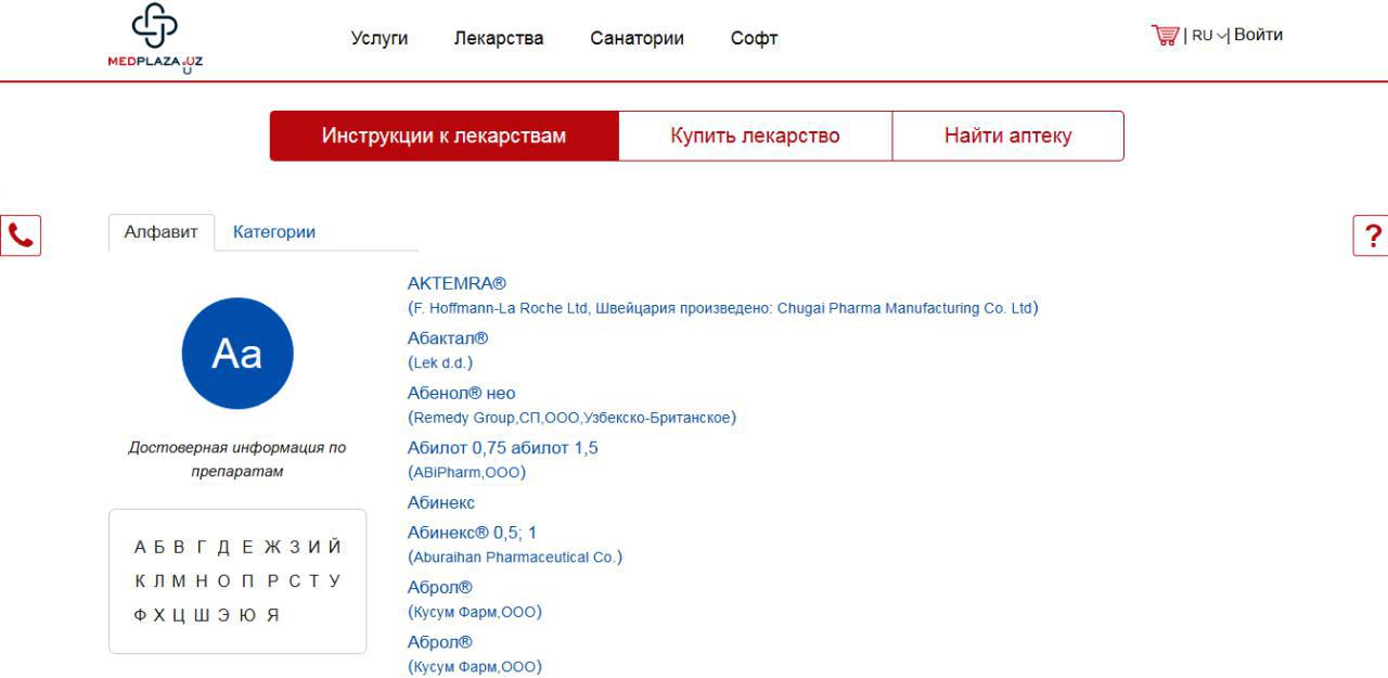 В целях обеспечения удобства поиска информации касательно медицинских препаратов и услуг, разработан проект MedPlaza.Uz. Онлайн площадка, при помощи которой, вы можете найти нужные вам лекарственные препараты, посмотреть близлежащие аптеки, а также забронировать медицинские услуги и процедуры, записаться к врачу и ознакомиться с информацией, касательно тех или иных процедур и препаратов.