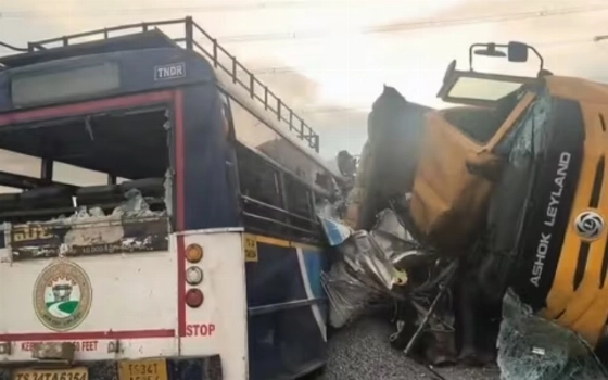 В районе штата Телангана (Индия) произошло лобовое столкновение грузовика и пассажирского автобуса, пишет Hindustan Times.