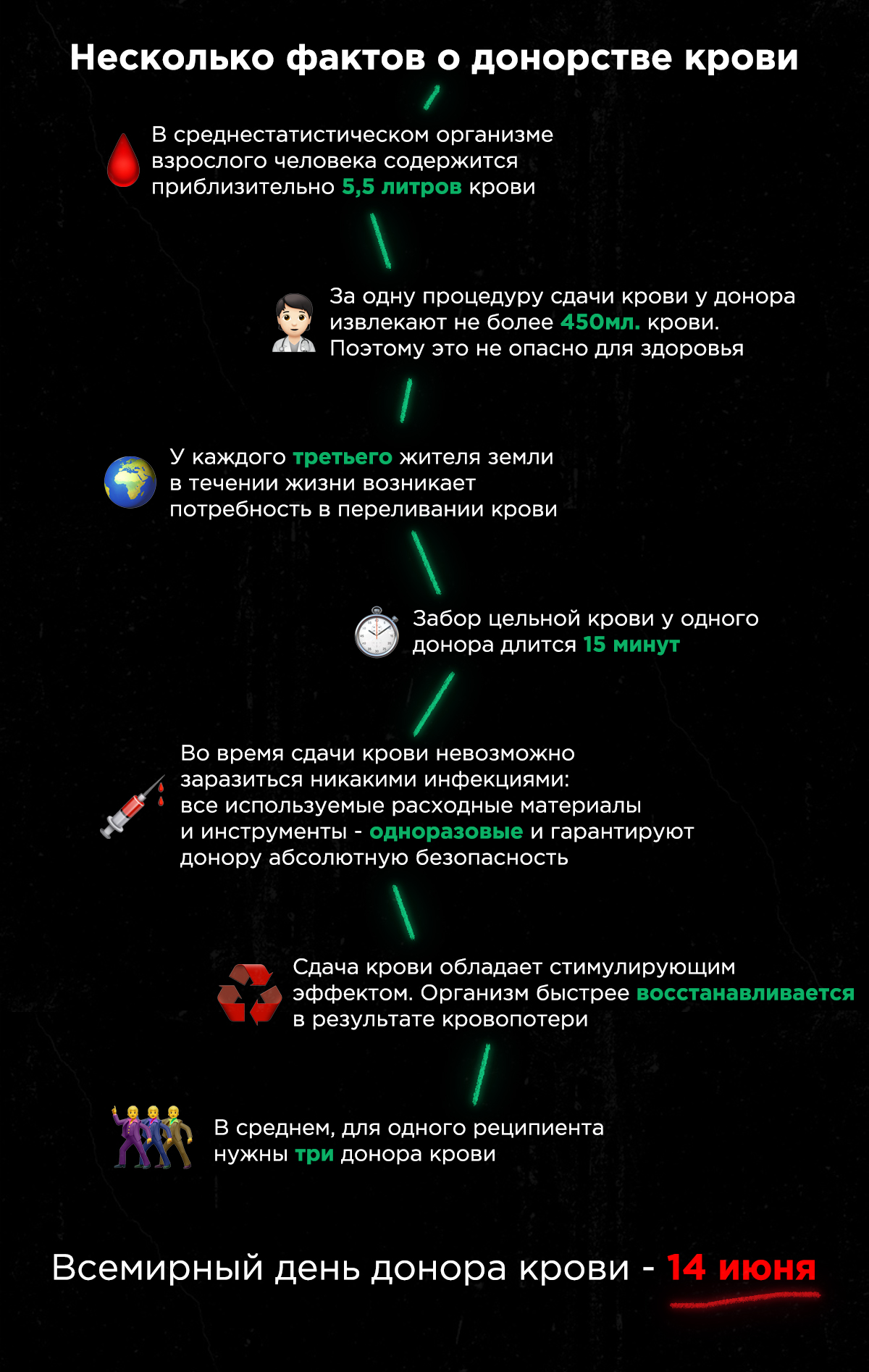 По статистике, каждые три секунды в мире кто-то нуждается в переливании крови. За одну процедуру донор сдает около 450 миллилитров, этого достаточного для сохранения жизни трем людям. Специалисты заверяют, что безвозмездное и регулярное донорство (не более 5 раз в год мужчинам и не более 4 раз женщинам) — самое эффективное решение данной проблемы.