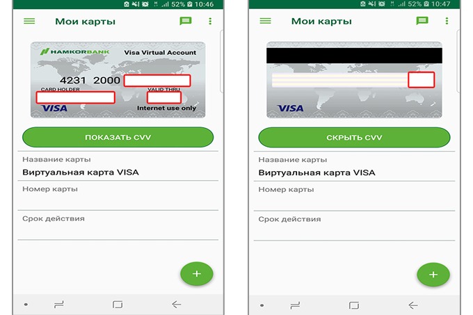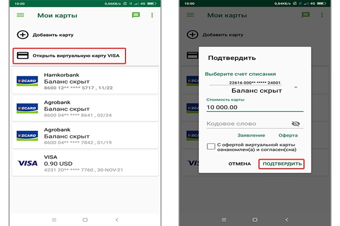 Оформление карты осуществляется с помощью мобильного приложения Hamkor Mobile и занимает всего пару минут. В разделе «Мои карты» нужно выбрать пункт «Открыть виртуальную карту».