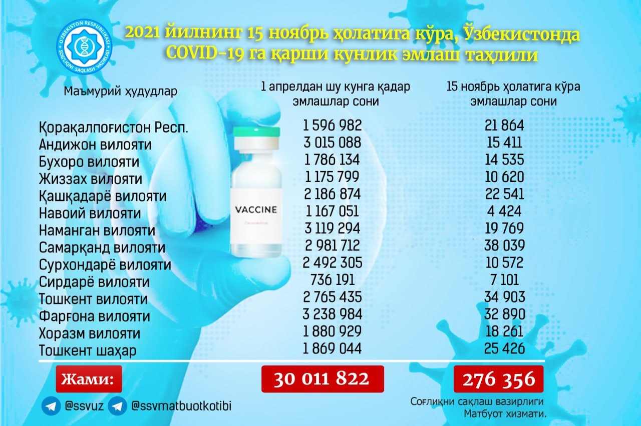 За сутки 15 ноября 2021 года в Узбекистане было использовано 276 356 доз препарата для вакцинации от «короны», сообщает Минздрав.