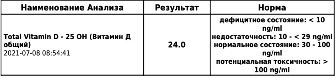 Это мои анализы на витамин D. Чтобы проверить, есть ли дефицит у вас, можно сдать кровь на анализ. У меня определили недостаточность содержания несмотря на то, что я жила в Узбекистане. Это напрямую влияло на мое настроение: апатичность, вялость, быстрая утомляемость, пониженная выносливость вовремя занятий спортом — это сильно мешало мне в моей обычной жизни.
