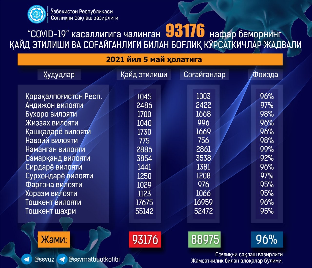В Республике Каракалпакстан 4 новых случая инфицирования, Бухарской — 2, Джизакской — 11, Кашкадарьинской — 2, Навоийской — 2, Наманганской — 5, Самаркандской — 184, Ферганской — 6, Сурхандарьинской — 9, Хорезмской — 3, Ташкентской — 68. В столице выявлено 144 новых пациента с коронавирусом.