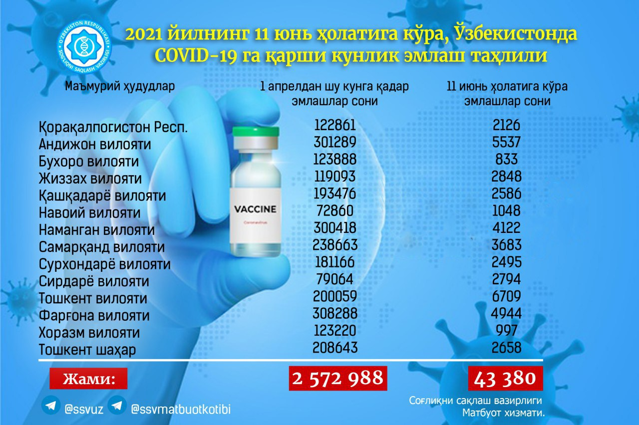 11 июня 43 380 доз вакцин против COVID-19 были использованы на всей территории нашей страны, сообщает Минздрав.