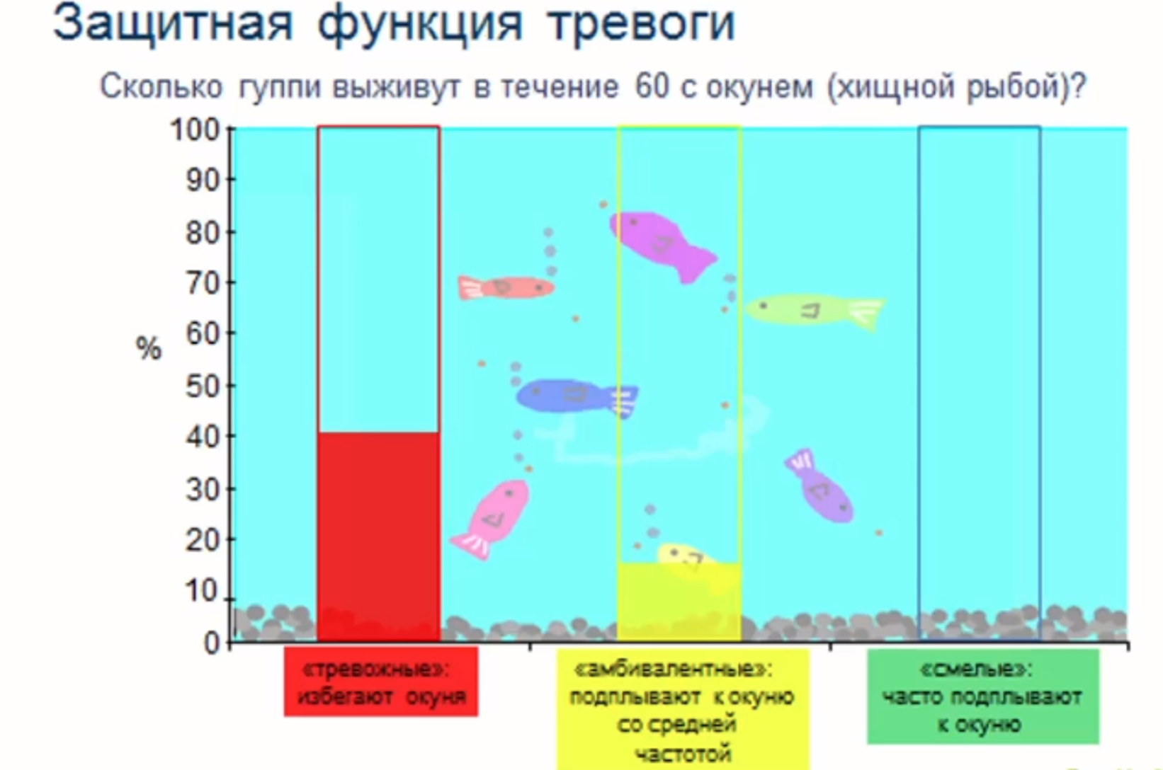 Ученые провели исследования на рыбках гуппи, которых разделили на три группы: храбрые, тревожные и амбивалентные. Был окунь, который был отделен перегородкой: храбрые подплывали близко, амбивалентные метались, тревожные наблюдали всю картину издалека. Их пометили. А потом перегородку убрали. Первыми были съедены храбрые, далее амбивалентные. Тревожные, как уже догадались, почти все спаслись. Этот эксперимент показывает, насколько полезна для нас тревога, и насколько она была полезна для наших предков.