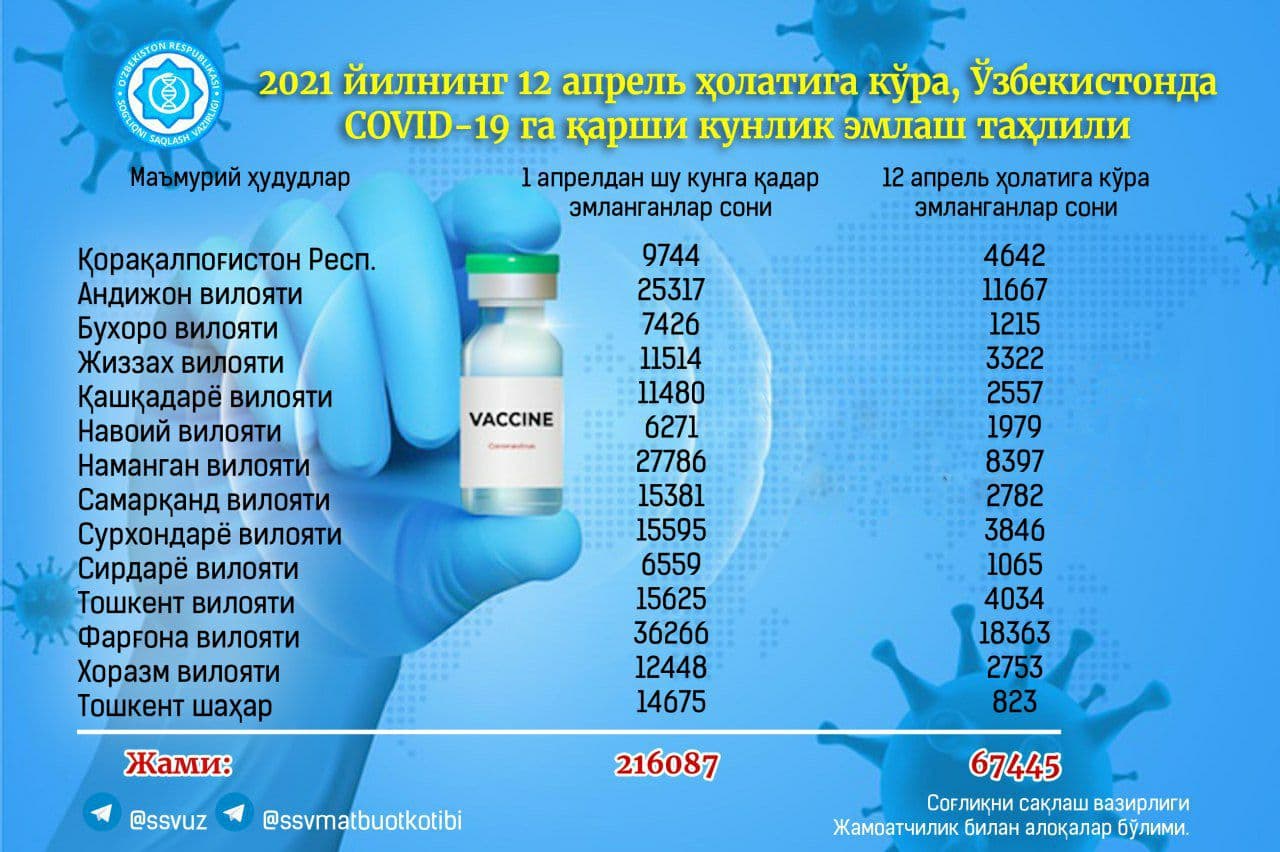 Общее количество вакцинированных составляет 216 087 человек из Ташкента, Нукуса и областных центров.
