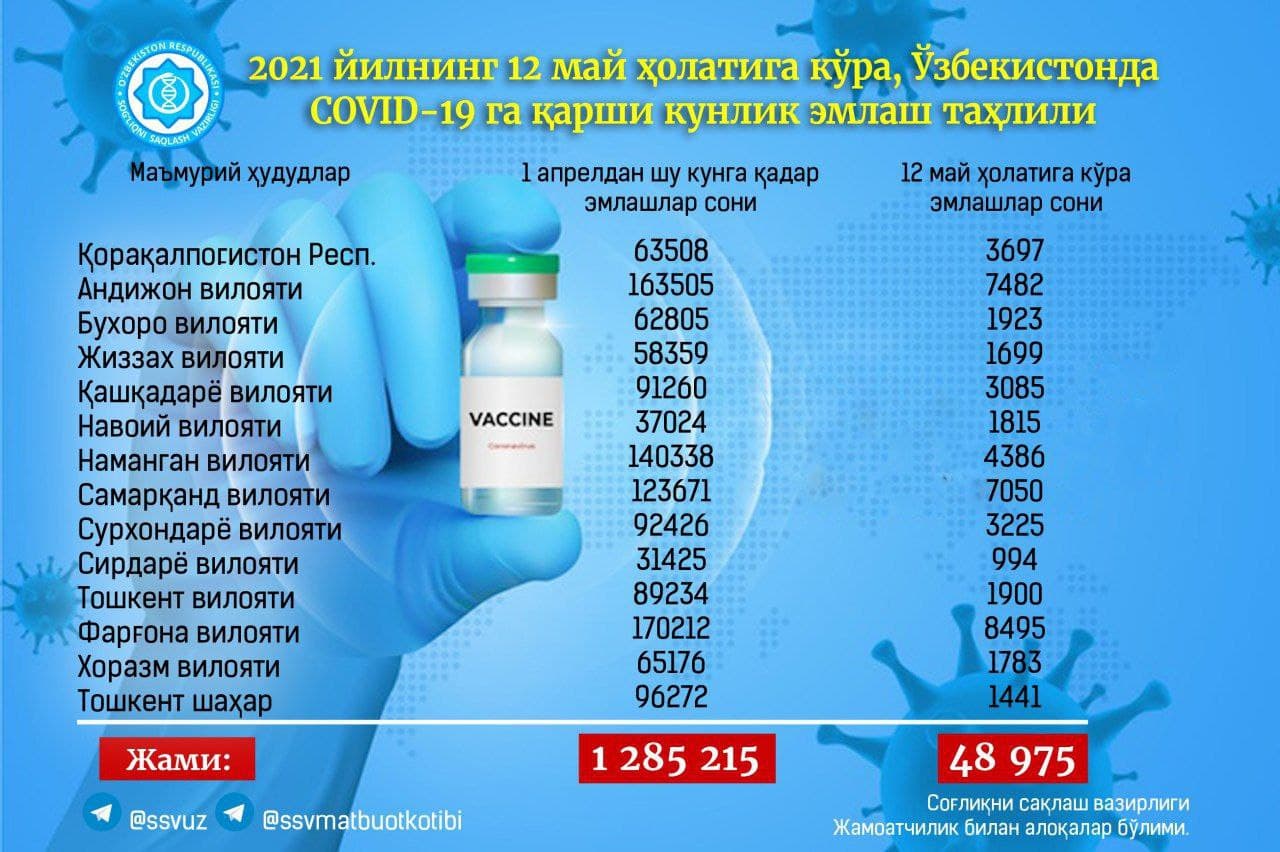 12 мая по всей стране было введено 48 975 дозы вакцины против COVID-19, сообщает пресс-служба Минздрава.
