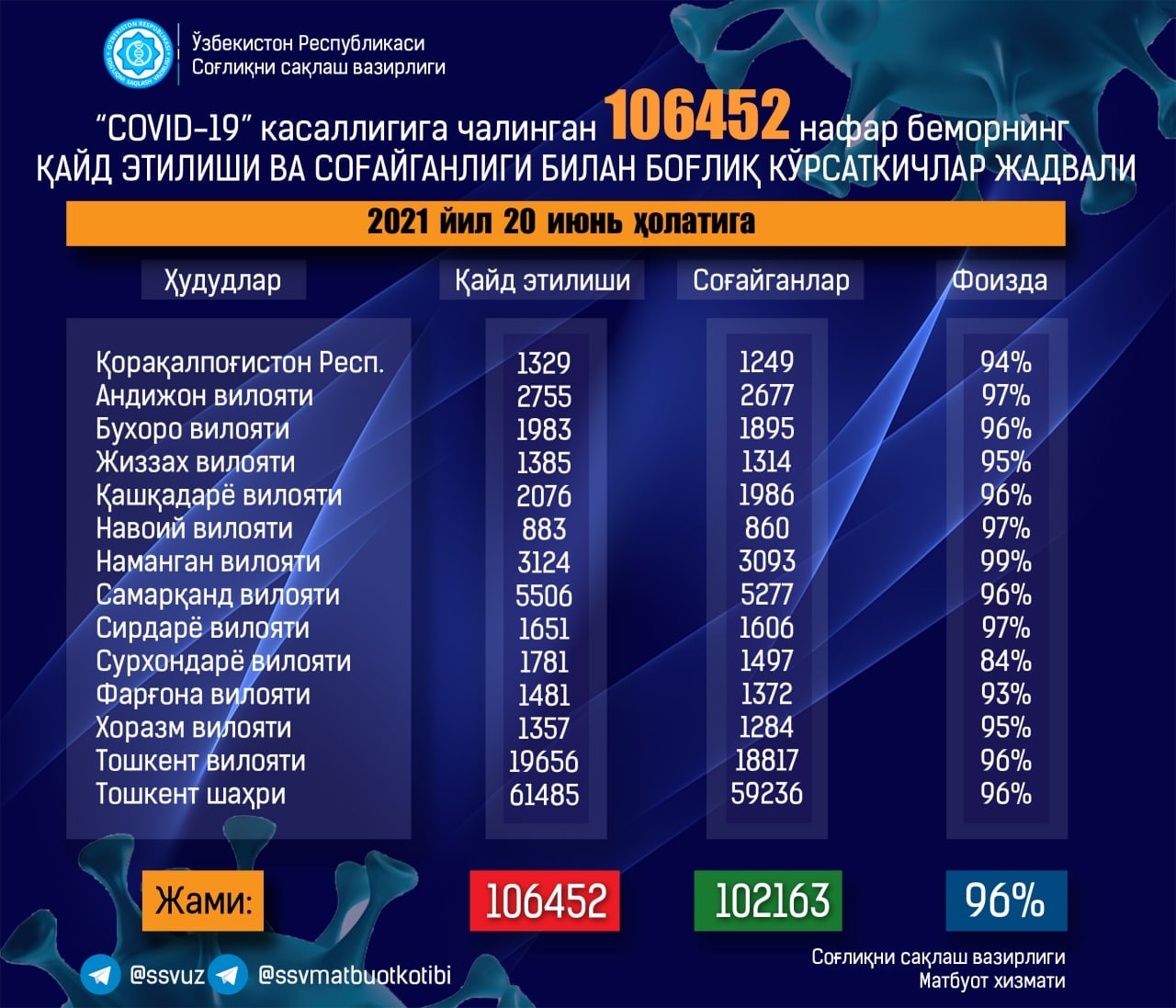 В Каракалпакской республике 6 новых случаев инфицирования, Андижанской области — 12, Бухарской — 20, Джизакской — 12, Кашкадарьинской —11, Навоийской — 2, Наманганской — 10, Самаркандской — 36, Сырдарьинской — 7, Сурхандарьинской — 40, Ферганской — 33, Хорезмской — 14, Ташкентской — 61. В столице выявлено 163 новых пациента с коронавирусом.