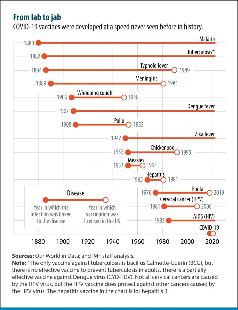 Эксперты создали инфографику, которая иллюстрирует, сколько времени понадобилось на создание каждой вакцины. Отмечается, что препараты от вирусов, где линия не заканчивается кругом, еще не созданы.