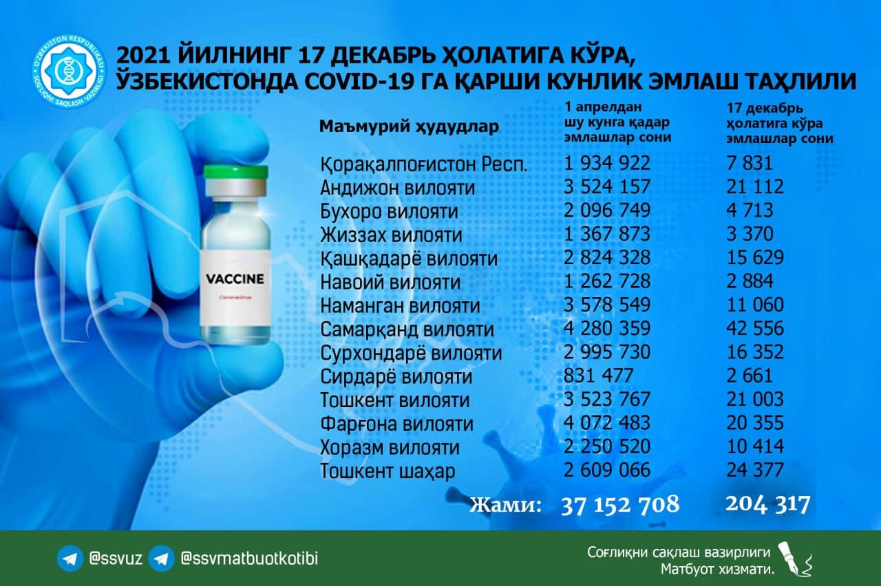 За сутки 17 декабря 2021 года в Узбекистане было использовано 204 317 доз препарата для вакцинации от «короны», сообщает Минздрав.