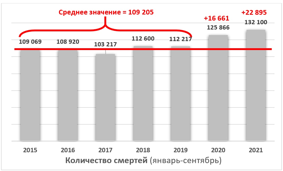 Потери 2021 года превысили избыточную смертность, которая была отмечена в первый год пандемии. И это при том, что до конца года оставалось ещё три полных месяца, по окончании которых количество смертей потенциально могло вырасти ещё на треть.