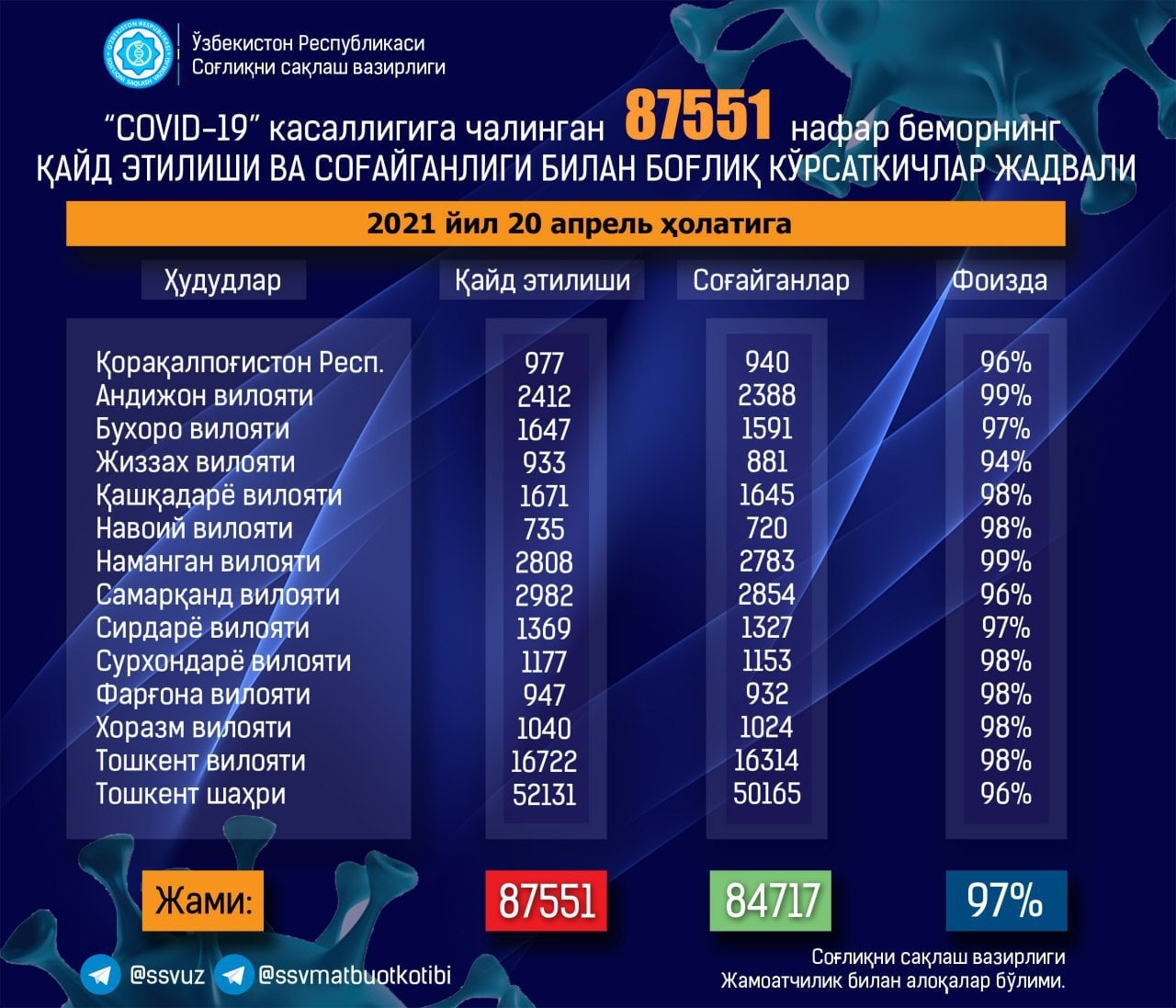 Общее количество выявленных случаев достигло отметки в 87 551 граждан. Больше всего заболевших в Ташкенте (202 случая).