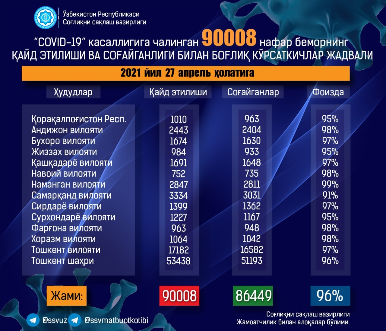 Общее количество выявленных случаев достигло отметки в 90 008 граждан. Больше всего заболевших в Ташкенте (180 зараженных).