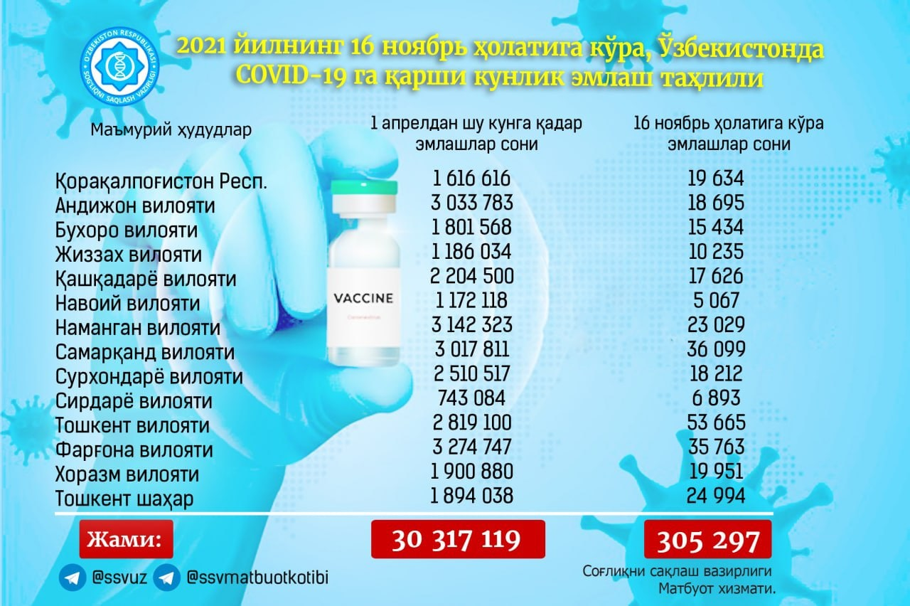 За сутки 16 ноября 2021 года в Узбекистане было использовано 305 297 доз препарата для вакцинации от «короны», сообщает Минздрав.