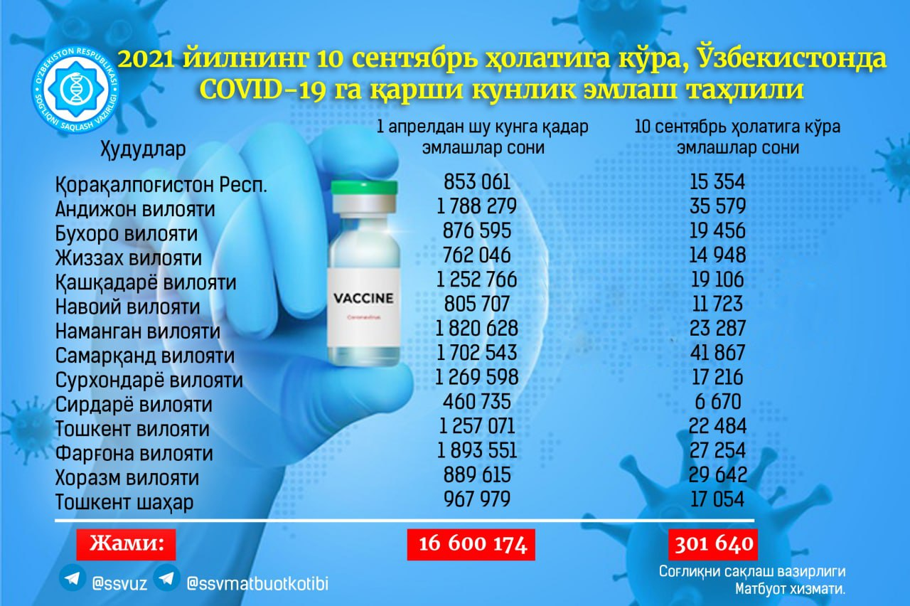 10 сентября 2021 года в Узбекистане от коронавируса вакцинировались 301 640 человек, сообщает Минздрав.