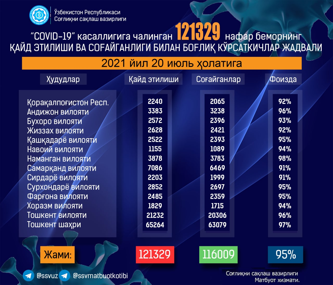 Отмечается, что показатель выздоровления составляет 95%. За 20 июля полностью излечились от коронавируса 495 пациентов, общее число вылечившихся составило 116 009.
