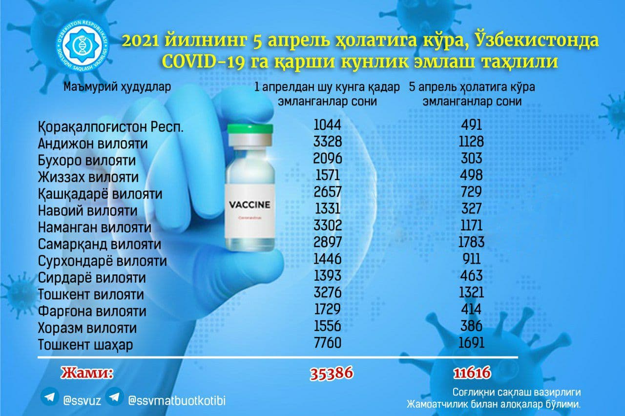С первого апреля общее количество вакцинированных составляет 35 386 человек из Ташкента, Нукуса и областных центров, сообщает пресс-служба Минздрава.