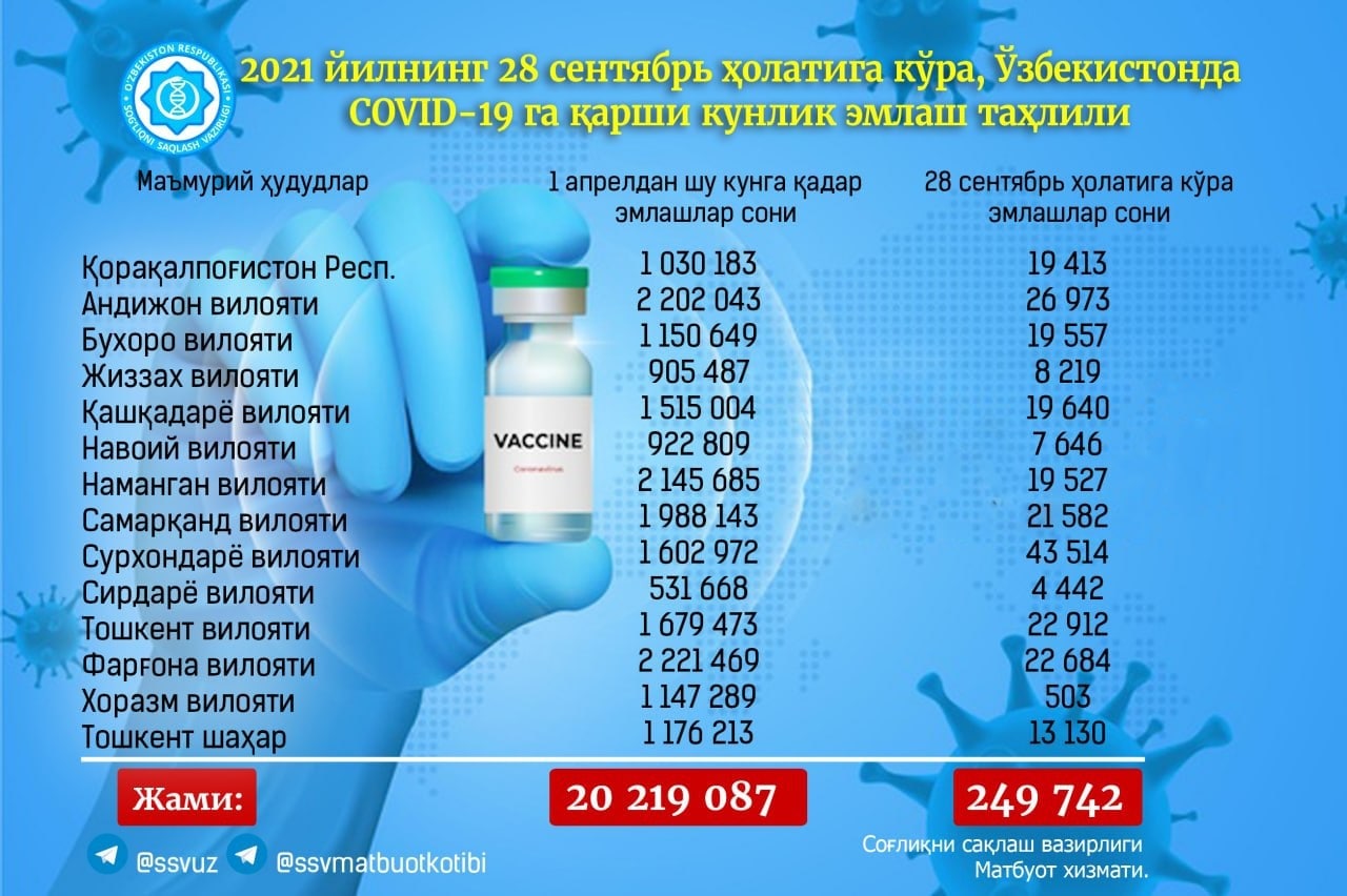 За 28 сентября 2021 года в Узбекистане было использовано 249 742 дозы препарата для вакцинации от «короны», сообщает Минздрав.