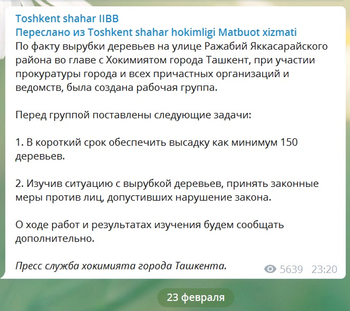 Торопился и заместитель хокима Яккасарайского района Абдувосилхон Саттаров, который, несмотря на судебный запрет, подписал 4 февраля 2020 года разрешения № 03−06/35 и № 03−06/40 на вырубку 70 деревьев. Чиновника даже не остановил введенный с 1 ноября 2019 года указом Президента мораторий на вырубку деревьев, который запрещает выдачу таких документов до конца 2020 года.