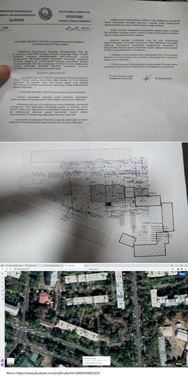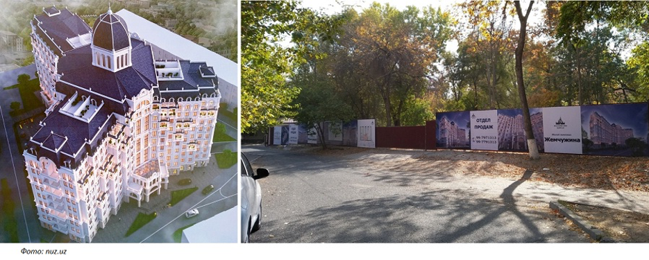 16 апреля 2018 года – за десять дней до своей отставки – бывший хоким Ташкента Рахмонбек Усманов подписал решение № 608, согласно которому ООО Building and Supplies был выделен в постоянное пользование земельный участок площадью 0,5 гектара между домами № 66/1, 66/2, 66/3, 66/4 и 72 по улице Юнуса Раджаби для строительства многоэтажного жилого дома (проект предусматривал строительство девятиэтажного жилого комплекса).