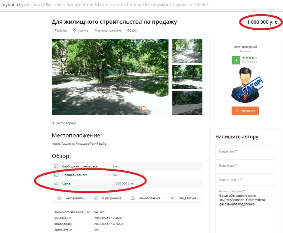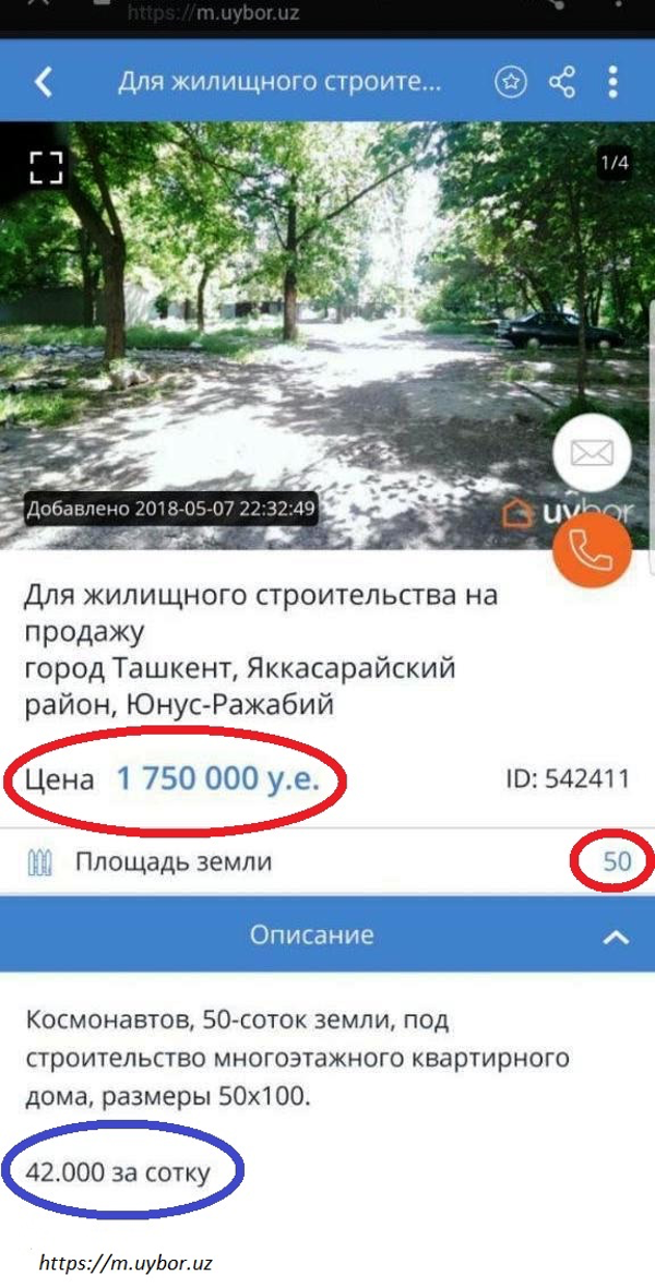 ООО Building and Supplies, всего через три недели после получения решения хокима Ташкента Рахмонбека Усманова, собралось продать, если выражаться юридически правильно, право постоянного пользования земельным участком из расчета 35 тысяч долларов за сотку. Правда, в тексте объявления застройщик сделал ошибку и вместо «35.000 за сотку» указал «42.000 за сотку». Видимо, инвестор привык лишь складывать и умножать, но никак не делить.