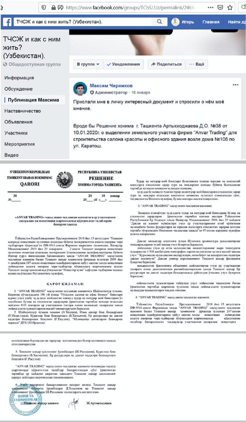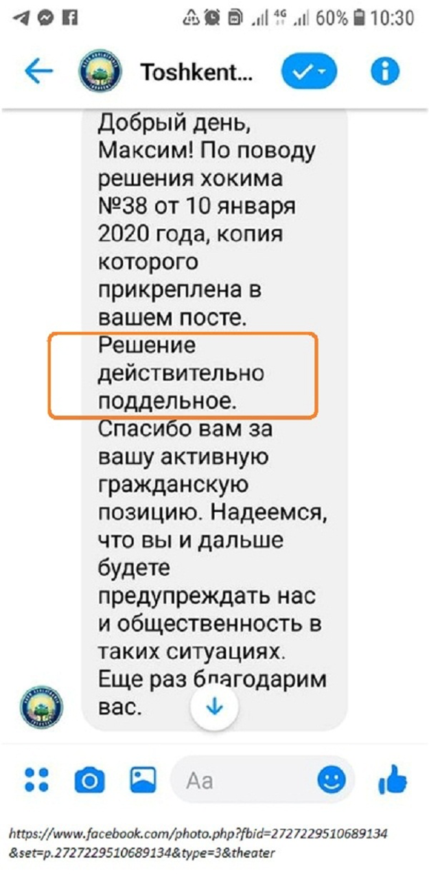 Хокимият просто констатирует, что «решение действительно поддельное». Ни обещаний разобраться в криминальной ситуации и наказать виновных, ни тени возмущения и озабоченности. Вот к чему приводит отсутствие системной работы и бесконтрольная выдача решений о выделении земельных участков! Вот к чему приводит отсутствие общественного контроля!
