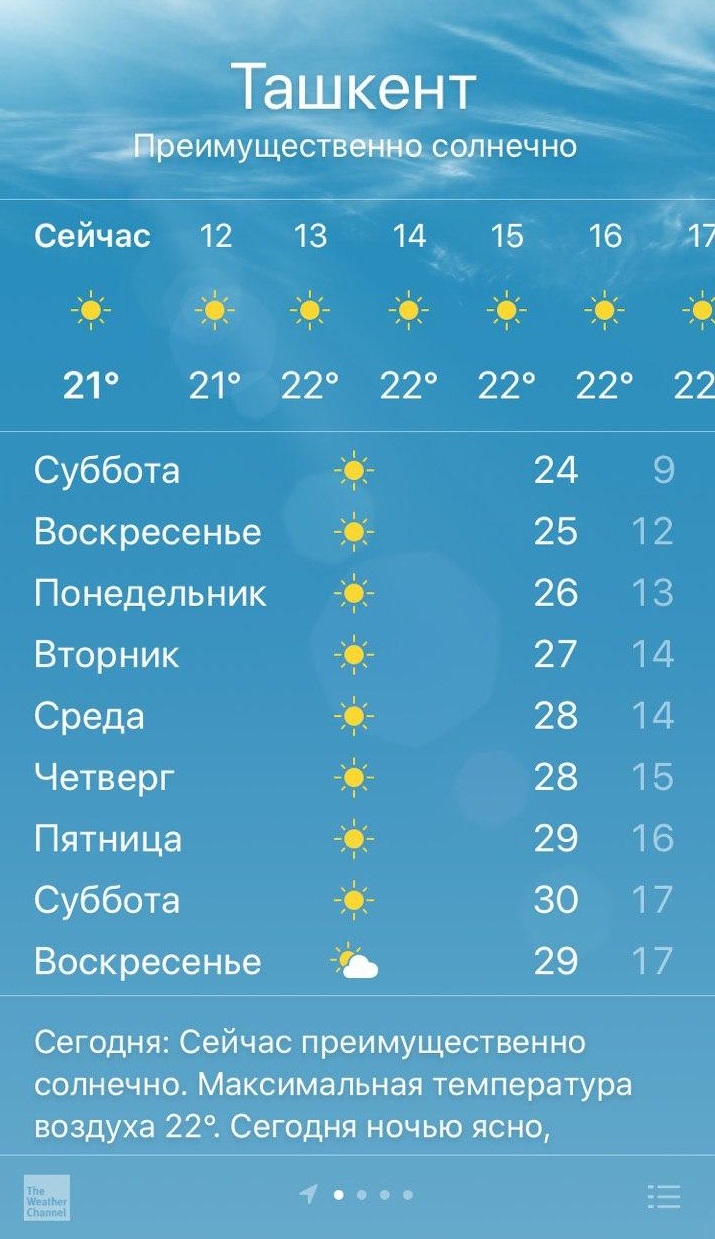 К концу следующей недели в Ташкенте ожидается потепление. Температура в субботу и воскресенье будет колебаться от 29 до 30 градусов.