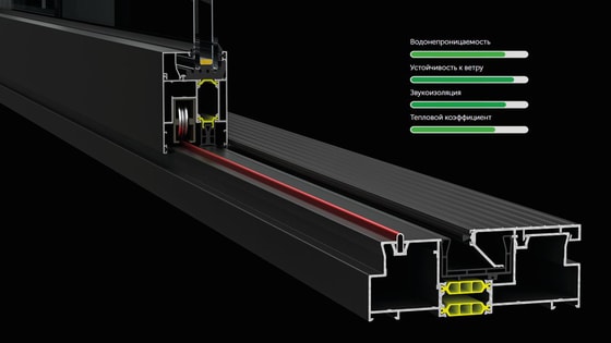 Полиамидные термомосты уменьшают тепловые потери конструкции, препятствуют промерзанию профиля с улицы даже в мороз, сохраняя комфортную для отдыха и работы температуру. Подъемно-раздвижная система BKH-65 защищена от протекания и продувания. Даже когда на улице проливной дождь и ветер, в будет доме тепло и сухо.