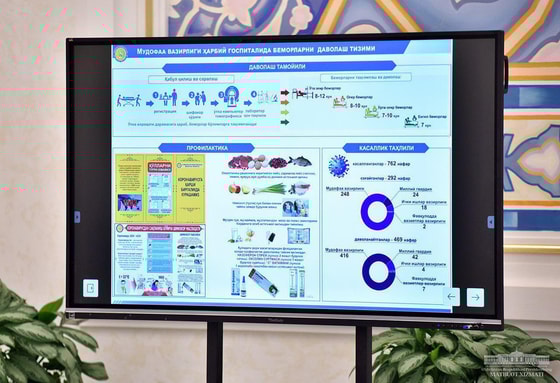 В ходе презентации Шавкат Мирзиёев акцентировал внимание на важности поддержки национальной системы здравоохранения в условиях пандемии, в том числе путем набора медперсонала в создаваемые распределительные центры и новые клиники на базе спортивных комплексов столицы, привлечения военнослужащих и специалистов-медиков военно-медицинских учреждений к мероприятиям по организации эффективного лечения инфицированных коронавирусом.