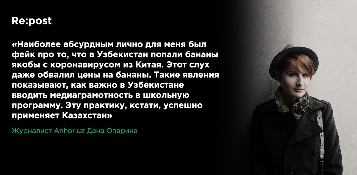 Как отметила журналист Anhor.uz Дана Опарина, в узбекистанском медиапространстве тревожным звонком был момент, когда произошла травля первой пациентки с коронавирусом в череде ожидавших медиапространство фейков.