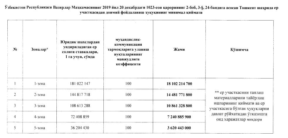 Минимальная стоимость права постоянного пользования участком земли в Ташкенте будет определяться в разрезе зон и районов.