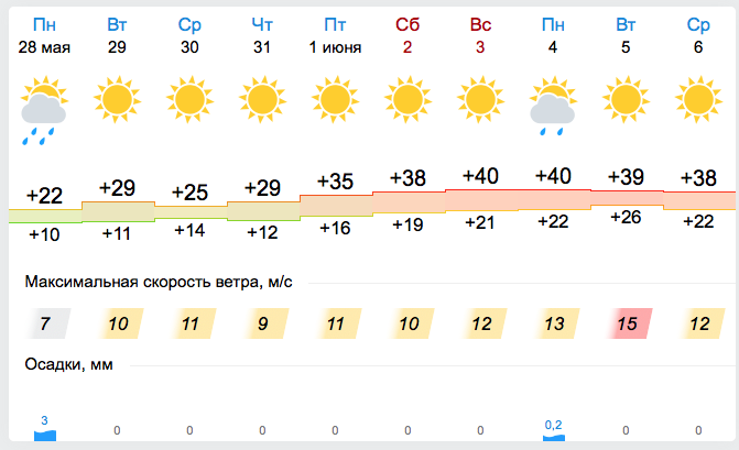 В Ташкенте и в других городах Узбекистана температура прогреется до +40 градусов в первые дни лета. Согласно прогнозу сервиса Gismeteo, самым жарким днем станет воскресенье – температура прогреется до +40 в течение дня, а ночью опустится до +21 градуса.