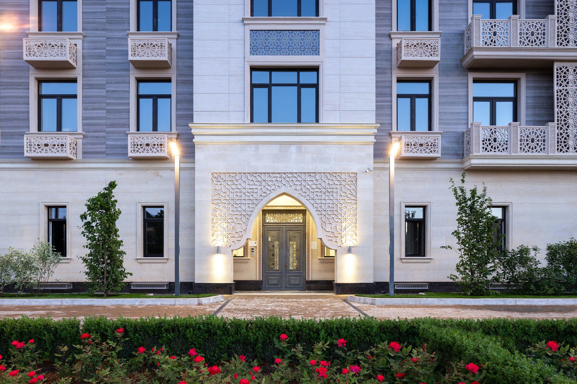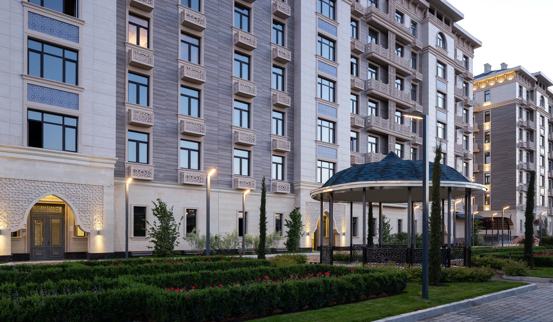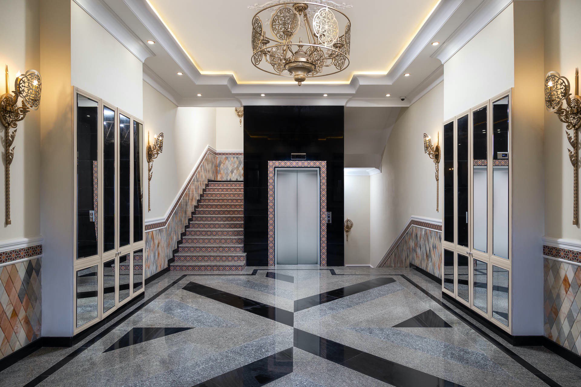 - просторные подъезды в восточном стиле. В каждом из них установлены домофоны,кованые двери, мозаика, усовершенствованные европейские лифты.