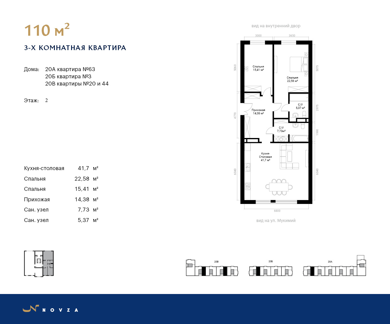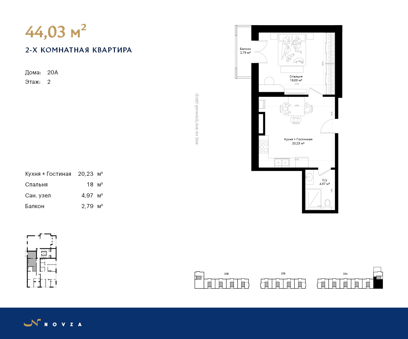 В жилом комплексе Novza доступны квартиры с площадями от 44 м² до 173м², в которых: