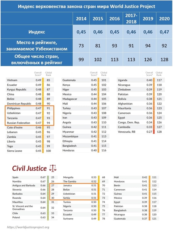 Данные The World Justice Project показывают, что какого-то прогресса в восприятии и соблюдении фундаментальных принципов верховенства закона в Узбекистане не наблюдается. Индекс верховенства закона в 2014-2020 годах находится в нашей стране в коридоре 0,45-0,47. Наши соседи: Кот-д’Ивуар (0,46), Замбия, Кения, Нигер, Того, Сьерра-Леоне - по 0,45.