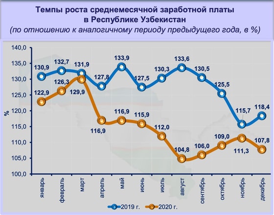 В Узбекистане среднемесячная номинальная начисленная заработная плата в 2020 году составила 2 млн 667 тысяч сумов, что на 14,8% больше по сравнению с 2019 годом, сообщает Госкомстат.