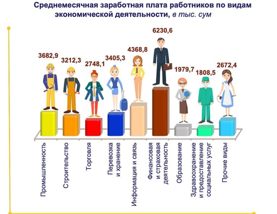 Наивысший уровень среднемесячной заработной платы наблюдался в финансовой и страховой деятельности и составил 6 230,6 тыс сумов, что в 2,3 раза выше общереспубликанского уровня, а наименьгий - в здравоохранении и предоставлении соцуслуг и составил 1 808,5 тыс сумов или 67,8 % от общереспубликанского уровня среднемесячной заработной платы.
