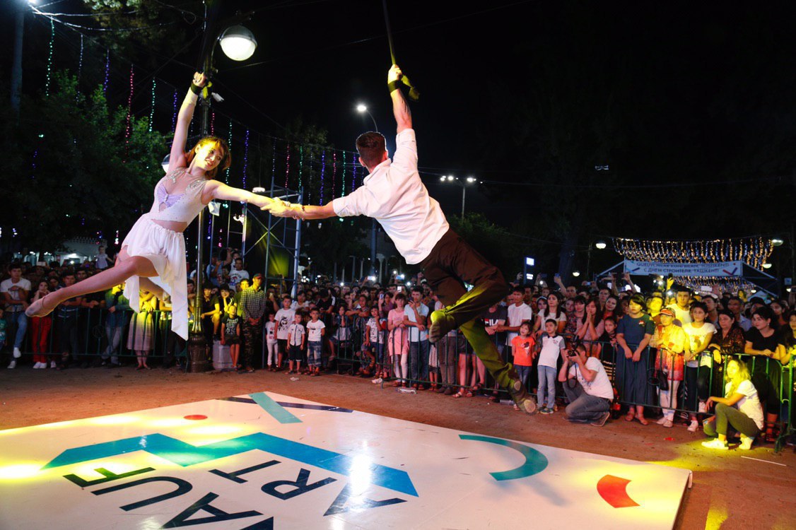 Еще одним зрелищным подарком гостям фестиваля «KNAUF ART» стало выступление воздушных гимнастов из труппы Узбекгосцирка, выполнивших сложные акробатические и танцевальные элементы.