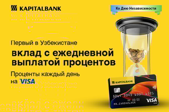 Проценты выплачиваются на сумовую карту международной платежной системы Visa. Причем, проценты весьма «аппетитные» — 21% годовых. Плюс, не стоит забывать: «Капиталбанк» сегодня — это крупный частный банк Узбекистана, он гарантирует 100% надежность и безопасность вкладов.