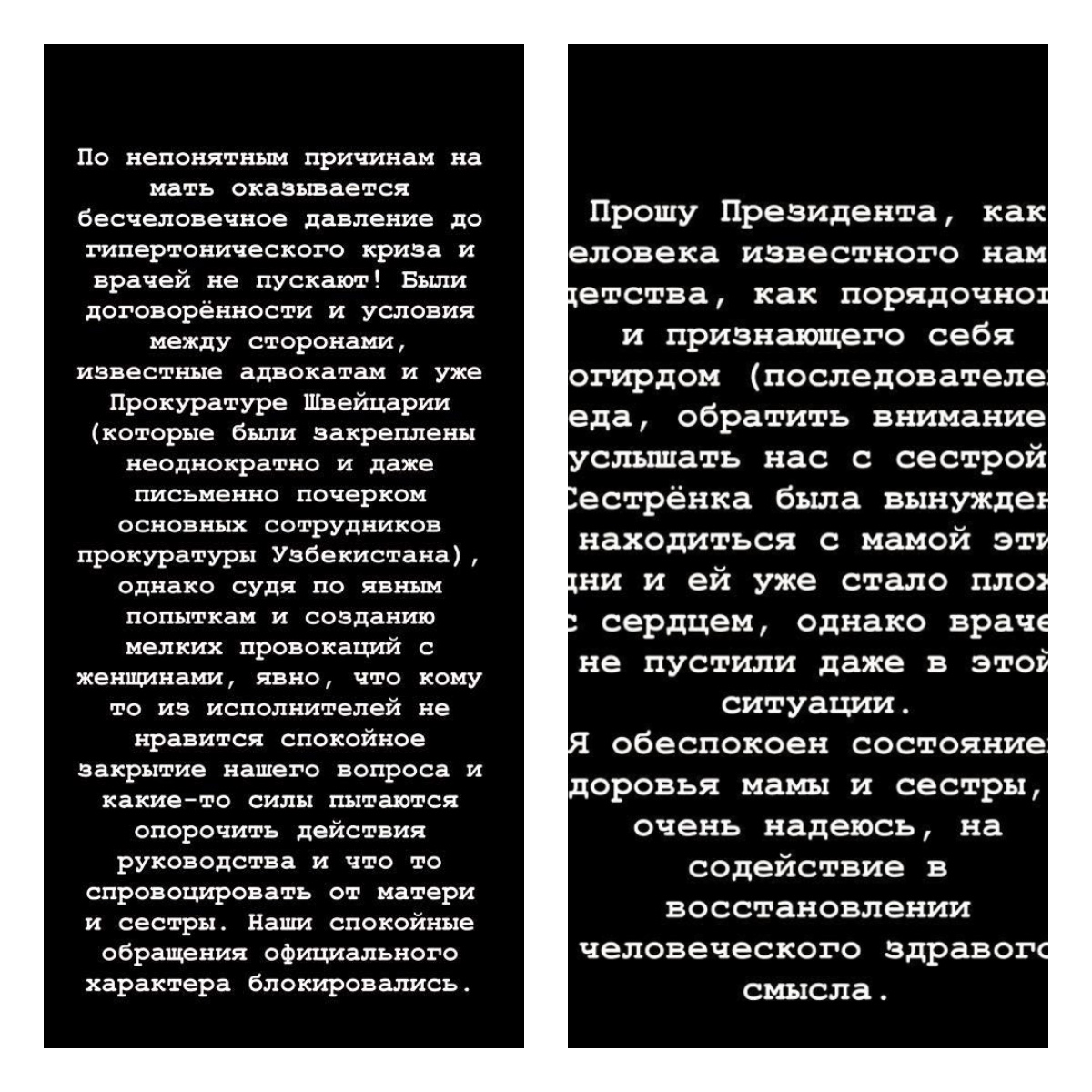 Сын Гульнары Каримовой Ислам Каримов в своем Instagram-аккаунте опубликовал обращение к президенту Узбекистана. По его словам, на мать (Гульнару Каримову – ред.) оказывается бесчеловечное давление до гипертонического криза. При этом к ней не пускают врачей.