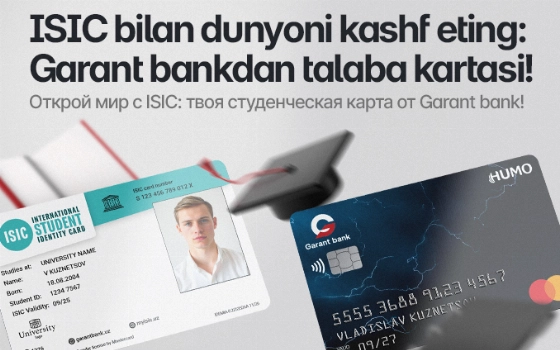 Не упустите шанс получить максимум возможностей от студенческой жизни. Обратитесь в головной офис Garant bank по адресу город Ташкент, ул. Саида Барака, 78 и оформите карту ISIC уже сегодня!
