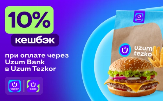 Теперь при оплате заказов в Uzum Tezkor через приложение Uzum Bank можно получить кешбэк 10%.